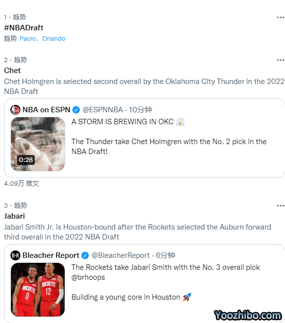 来源:24直播网06-24 09:3024直播网06月24日讯 ,NBA正式举行2022年选秀仪式,保罗-班凯罗爆冷逆袭,被魔术选中当选新科状元;雷霆榜眼签选中切特-霍姆格伦,火箭用探花签选中贾巴里-史密斯;班凯罗当选状元冲上推特热搜榜第一名引热议,魔术截胡火箭,名嘴却直呼火箭该感谢魔术和雷霆。