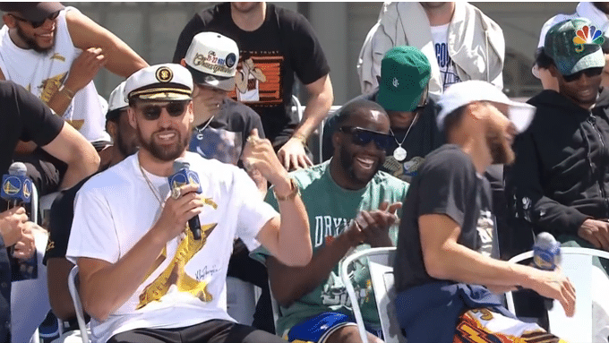 在庆典现场,主持人说汤普森没有在G6赛后落泪,汤普森打断并且调侃:谁会在球场上哭啊;库里哈哈大笑并且表示:球场上还不能哭了?克莱继续冷酷地回复:我又没哭,可你哭了啊。
