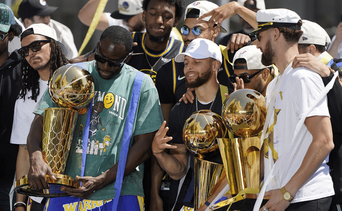 汤普森累得打哈欠!调侃库里哭泣逗笑众人 庆典后和格林一起去泡澡