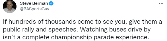 Steve Berman发推写道:如果成千上万的人来看你,给他们一个公开集会和演讲,观看巴士驶过并不是一次完整的夺冠游行体验。