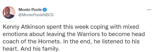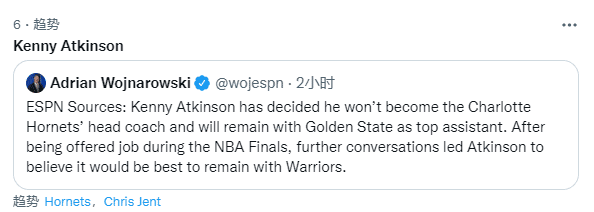 如今勇士夺冠后,阿特金森做出“拒绝担任黄蜂主帅”的决定,经过总决赛之后,他相信留在勇士是最好的选择;勇士记者Monte Poole跟进报道——本周,阿特金森一直在应对将要离开勇士成为黄蜂主帅所带来的复杂情绪,最后他听从了自己的心声以及他家人的建议。
