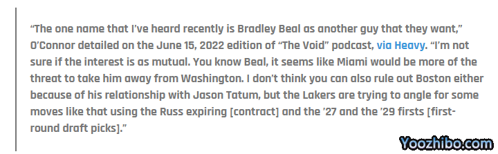 据KevinO'Connor报道,比尔可能成为湖人引援的目标,表示:我不确定双方的兴趣是否是相互的。似乎迈阿密热火更有希望抢走比尔,因为比尔和塔图姆的关系,不排除他前往波士顿;但湖人正试图引援比尔,他们可以用威少即将到期的合同和2027、2029年的首轮选项权来推动这笔交易。