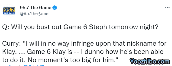 记者问到下一场能否逼出“G6库”,对此库里表示:我不会侵犯到关于克莱的称号...G6汤——我都不知道他是如何做到的,但对于他来说,没有什么时刻是不重要的。