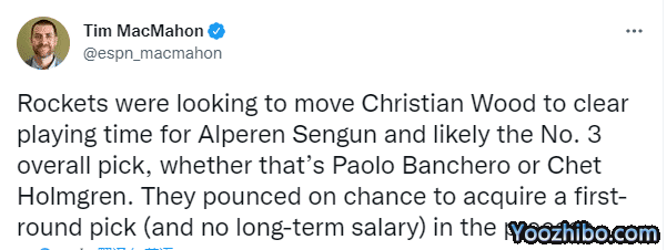 名记Tim MacMahon分析火箭交易伍德的原因,发推写道:火箭交易伍德是为了给申京和今年3号秀(无论班切罗还是霍姆格伦)腾出位置和上场时间;火箭获得首轮选秀权并且没有获得长期合同。