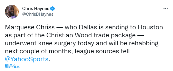 另外在这笔交易中,克里斯今天接受了膝盖手术,将需要几个月的康复期,预计他将会被火箭裁掉,目前火箭大名单上有20名球员。