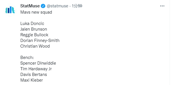 美媒列独行侠新赛季核心阵容,首发五虎分别是东契奇、布伦森、布洛克、芬尼-史密斯和伍德;替补阵容中有丁威迪、小哈达威、贝尔坦斯、克莱伯。