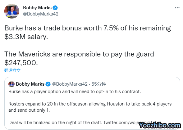 薪资专家Bobby Marks表示,伯克与独行侠签下的3年945万美元合同中,2022-23赛季为球员选项。伯克需要执行他的球员选项。