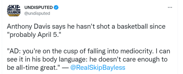 名嘴斯基普-贝勒斯和香农-夏普在最新一期的播客节目上讨论这一话题。两人都对浓眉的行为表示不解和恼火。被称为“头号詹黑”的贝勒斯在节目上表示:“你有太多钱了,那可能让你变得软弱和懒惰。你还有比弗利山庄的豪宅,你很难对自己说我需要去好好工作,但你最好这么做。AD(浓眉),你正处于沦为平庸的边缘。我可以从他的肢体语言中看出来:他并不在乎能否成为历史上伟大的球员。”