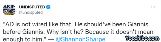 夏普也表示:“AD不是詹姆斯、乔丹、科比那样的球星。但他本该在扬尼斯(字母哥)之前成为扬尼斯,他有6英尺10英寸,能投篮,能抢篮板,相当全面……为什么他没有做到?因为那对他来说还不够重要,就是这样。”