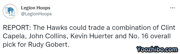 据B/R名记Jake Fischer报道,联盟中有很多老鹰和爵士关于戈贝尔交易的讨论,老鹰方面的交易筹码有:卡佩拉、科林斯、许尔特、16号签;爵士和老鹰可能达成1换4大交易,戈贝尔有可能联手特雷-杨,卡佩拉有可能联手米切尔。