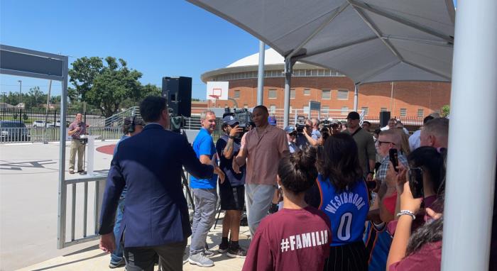 在剪彩仪式上,俄城市长给了威少一把城市钥匙,并且告诉威少他有资格代表雷霆发言;威少领取钥匙后表达了自己对这座城市的感谢,他说:我想尽我所能地继续去支持俄克拉荷马城。这个地方曾经是我的家,现在仍然是我的家!