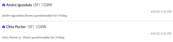 勇士球员伊戈达拉和奥托-波特都是出战成疑,库里被列为大概率出战;怀斯曼将因伤继续缺席比赛。