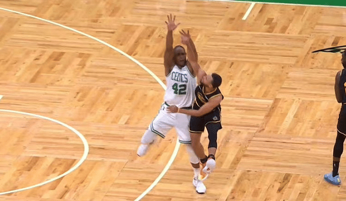 第三节初期,斯玛特在弧顶持球准备出手,库里从身后犯规,之后斯玛特出手,裁判福斯特给了库里本场比赛个人的第4次犯规,同时还示意是三分球犯规,也就是说斯玛特获得了3次罚球的机会。库里摇头表示不满,这次的犯规是在斯玛特出手之前,库里伸手之后,斯玛特才做出了投篮的动作,而并非库里影响了斯玛特的投篮,所以也引发了争议。