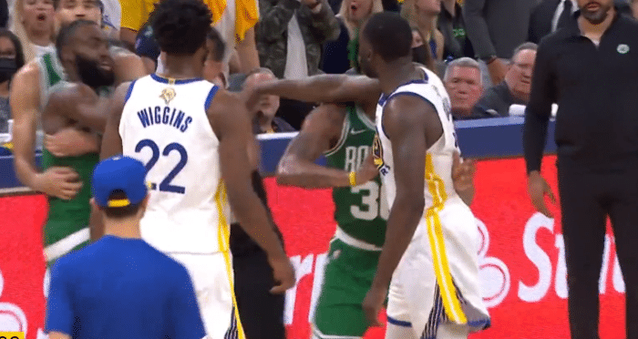 上半场快结束时,格林外线对杰伦-布朗犯规,格林倒地时把脚放在布朗的脑袋上并且从背后推了一把布朗,两人发生冲突吵起来,对此裁判仅仅吹罚普通犯规,没有技犯也没有恶犯,格林逃过一劫。