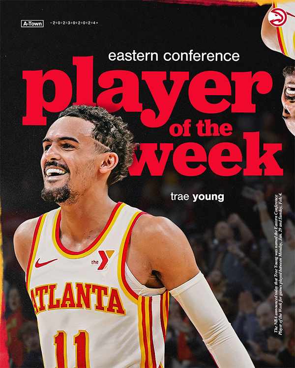 东部周最佳球员是特雷-杨,上周杨带领老鹰3胜0负,场均得到31分1篮板11.3助攻1.7抢断,投篮命中率56.9%,三分命中率64.5%,罚球命中率77.8%。