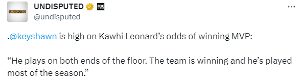赛季至今,小卡已经出战44场比赛,场均拿到24.2分6.4篮板3.7助攻1.7抢断和0.9盖帽,快船35胜15负排在西部第三位,对于小卡的出色表现,名嘴Skip表示小卡可以争夺MVP:莱昂纳德是快船队的动力,在他的带领下,快船可以走得更远;名嘴Keyshawn Johnson则表示小卡赢得MVP的几率很高:他在场上打出攻防一体的表现,球队正在获胜,而且他打了整个赛季的大部分时间。
