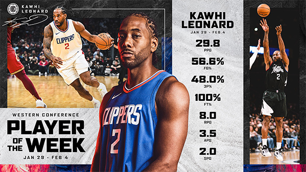 上周,小卡率快船取得3胜1负的战绩,场均得到29.8分8篮板3.5助攻2抢断1盖帽,投篮命中率56.6%,三分命中率48%,罚球命中率100%;小卡打出了不可思议的200俱乐部级别的表现,生涯首次在4场比赛中场均至少29分8篮板且罚球命中率100%,也是快船队史首位打出如此表现的球员。
