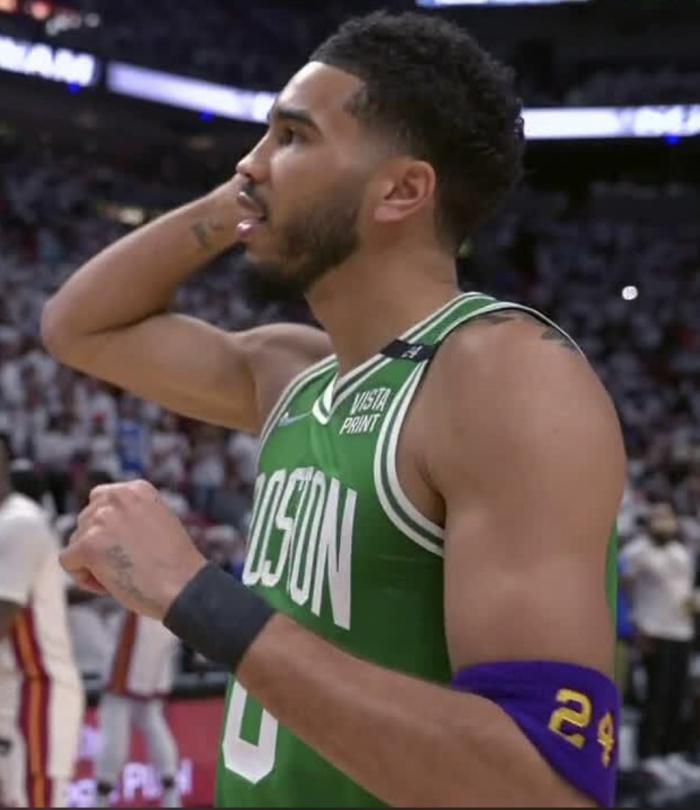 在今年东决抢七大战中,塔图姆佩戴科比的24号护肘,并且在赛前给科比发消息:今天我与你同在;此战全场拿到26分10篮板6助攻2盖帽1抢断,带队拿下生死战,4-3淘汰热火