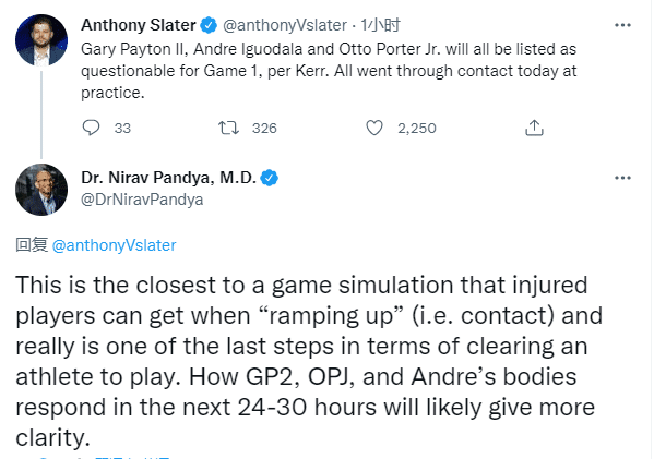 医学专家Nirav Pandya发推表示:这是受伤球员最接近复出时能做到的比赛模拟,实际上这是球员获得参赛资格的最后一步,未来24-30小时将会有更清晰的结果。