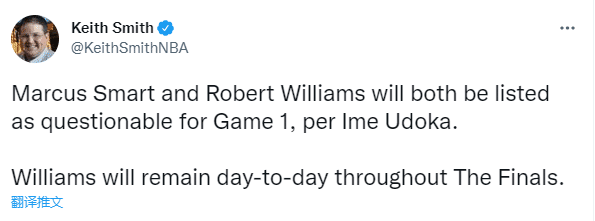 凯尔特人队总决赛G1伤情也出炉,斯玛特(脚踝扭伤)和罗威(膝伤)都被列为出战成疑,此前在东决系列赛,他们都带伤参加比赛;今日斯玛特透露他的脚踝扭伤很严重,谢天谢地能带伤出战;乌度卡则表示斯玛特和罗威的伤情不同,前者的伤势会随着时间推移而好转。