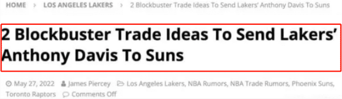 美媒给出建议,湖人队可以和太阳队、猛龙队进行一笔涉及3方5人的超级交易,而艾顿、浓眉哥、阿奴诺比是交易核心。