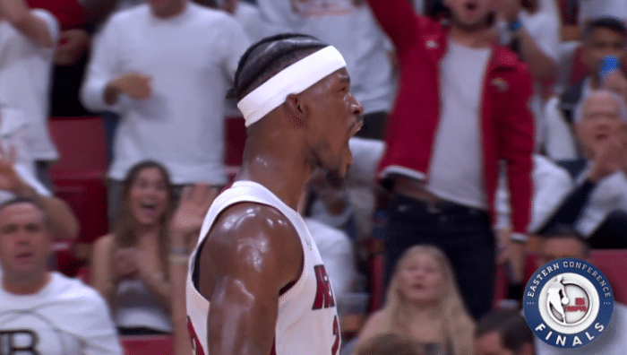 巴特勒投进三分球打停凯尔特人时,他仰天怒吼庆祝,尽情宣泄情绪。