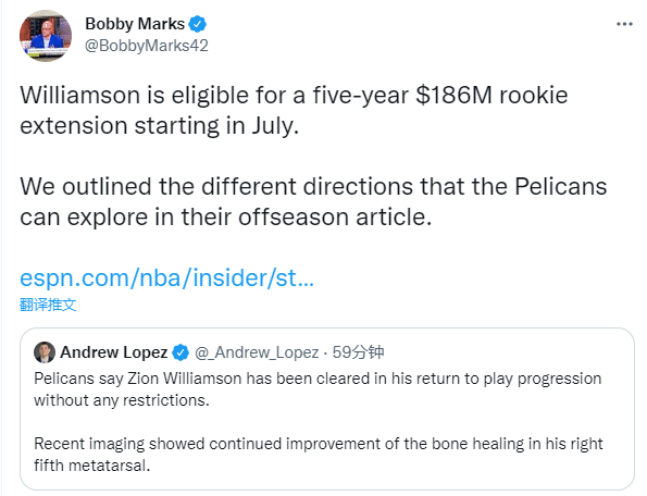 锡安痊愈,薪资专家Bobby Marks报道,锡安作为2019年的状元,今年夏天有资格与鹈鹕签下一份5年1.81亿美元的新秀续约合同,如果他在2022-23赛季入选最佳阵容,这份合同将额外增加3600万美元。
