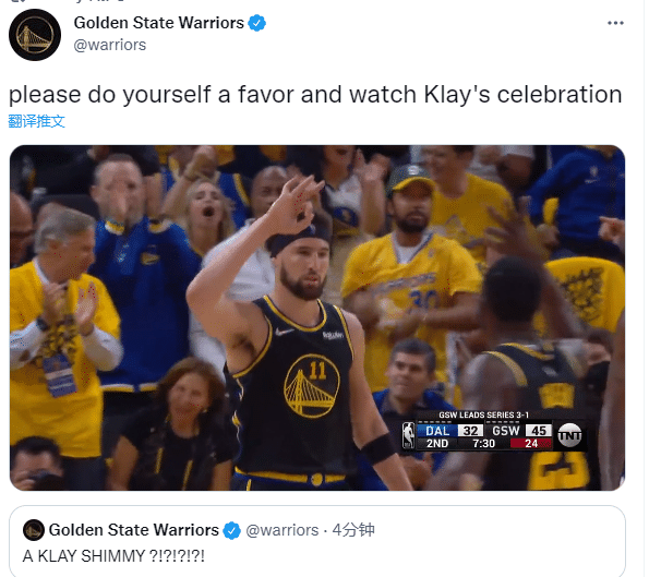 第二节,库里休息时,普尔和汤普森带队拉开分差,普尔上来贡献9分,汤普森又轰进两记三分,汤神归位点燃球馆,打停独行侠疯狂抖肩庆祝,勇士官方发推庆祝。