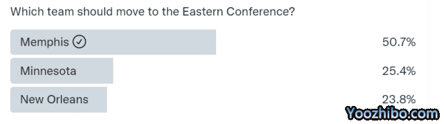 至于哪支球队将因为新军加入而从西部换到东部,还没有官方的证实,只是此前有爆料称灰熊未来可能成为东部球队。存在这种可能性的还有鹈鹕和森林狼。相应的球迷投票表明,超过五成球迷还是支持灰熊划入东部。