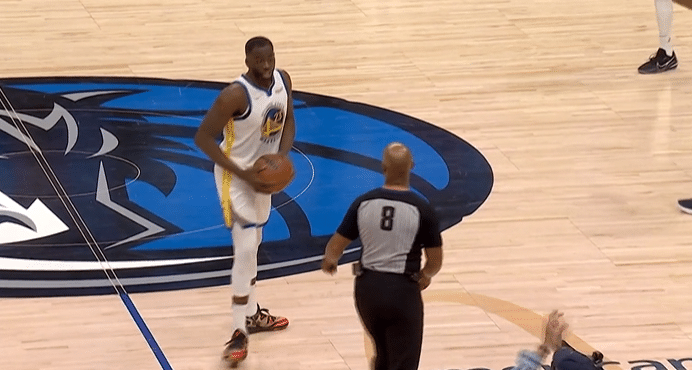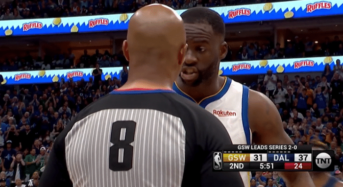 这是第二节中段,勇士进攻的机会,追梦格林在本方进攻半场接球,位置接近半场边线,裁判吹罚追梦格林回场违例。追梦格林觉得自己冤枉,上前与裁判争论,接着被吹罚了一个技术犯规,东契奇技术罚球命中。