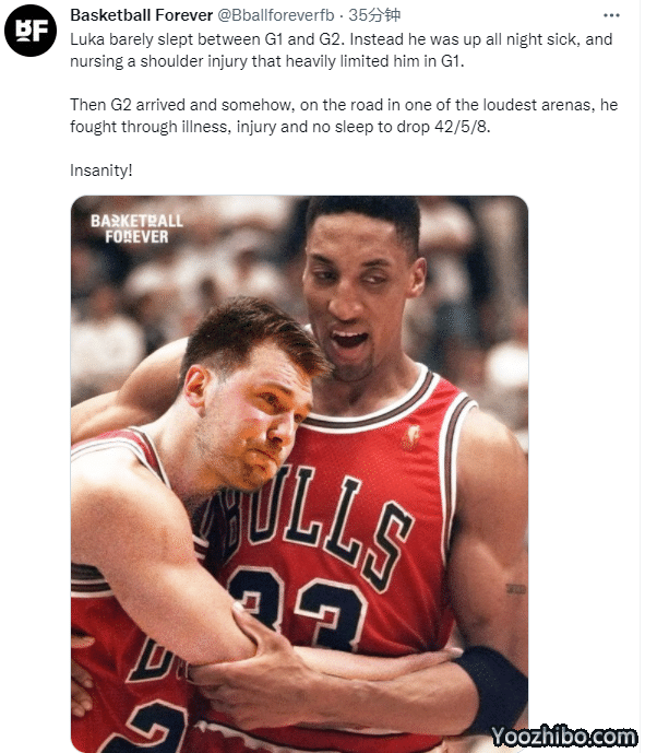 美媒调侃东契奇带病出战西决,恶搞东契奇趴在皮蓬怀里(当年乔丹流感之战之后累倒在皮蓬的怀中),配文写道:在西决G1和G2之间,东契奇几乎没有睡觉。取而代之的是,他彻夜难眠,肩伤严重限制了他在 G1 中的表现。在西决G2,他与疾病、伤病和失眠作斗争,轰下42分8篮板5助攻。