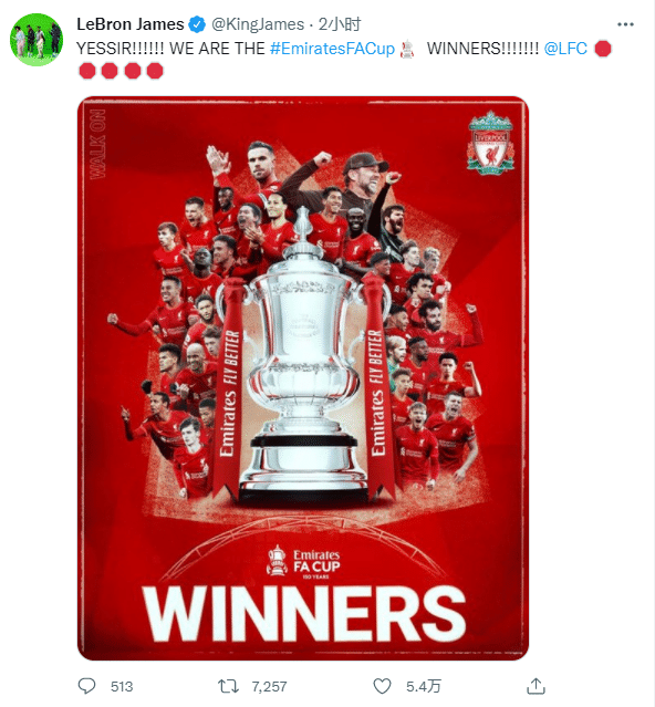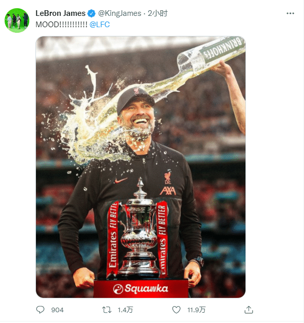 不久前,利物浦击败切尔西夺得足总杯冠军,詹姆斯连续发推庆祝利物浦夺冠,晒照并写道:此刻的心情;还转发利物浦夺冠海报,配文:是的,我们是足总杯冠军!