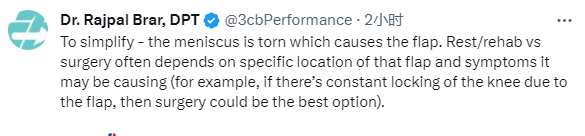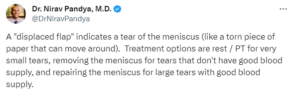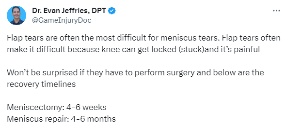医学专家Evan Jeffries表示瓣状撕裂通常是半月板撕裂中最困难的。皮瓣撕裂通常会造成困难,因为膝盖可能会被卡主并且很痛苦 如果必须进行手术,我不会感到惊讶——半月板切除手术,至少伤停4-6周;半月板修复手术,至少伤停4-6个月。