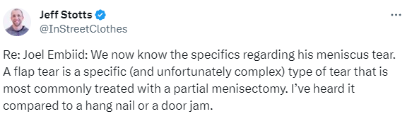 Jeff Stotts表示我们现在知道了恩比德的半月板撕裂的具体情况。皮瓣撕裂是一种特殊的撕裂类型,最常采用的治疗方案是切除部分半月板。