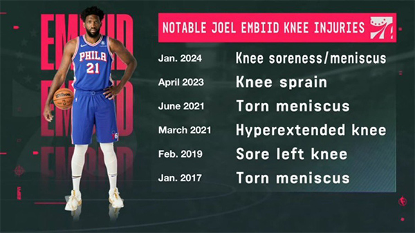 生涯至今,恩比德已经多次遭遇膝盖伤病——2016-17赛季遭遇左膝半月板撕裂,因伤缺席了37场比赛;2019年2月左膝酸痛;2021年3月膝盖过度伸展;2021年6月在季后赛遭遇半月板撕裂;2023年4月扭伤膝盖,现在膝盖半月板又伤了。