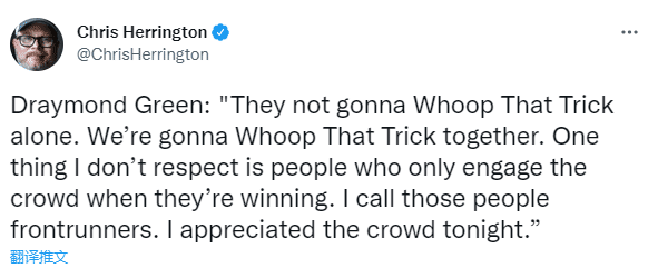 赛后谈到自己跟着灰熊球迷挥毛巾的原因,格林解释:不能让他们(灰熊球迷)在那自己唱《揍他们》,我们得一起唱。有一件事我一直很不喜欢,有些人只在获胜时才与球迷互动。我把这些人称为‘精英团队’,我不会回避失败,我也没把自己当成‘精英’,我很欣赏今晚的球迷们。