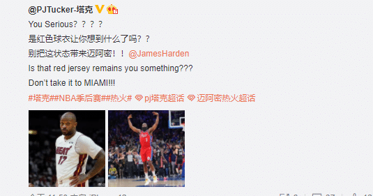 这场比赛结束之后,热火球员塔克在社交媒体上谈到哈登的爆发,忍不住感叹道:“是红色球衣让你想到什么了吗??别把这状态带来迈阿密!”