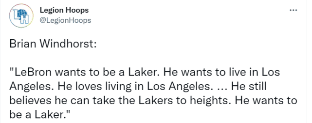 此前,NBA名记布莱恩-文霍斯特在节目上表示,詹姆斯本人同样不愿意离开湖人。"勒布朗想要(继续)成为一名湖人球员,他想要生活在洛杉矶,也喜欢生活在洛杉矶……他仍然相信他能带领湖人抵达巅峰,他想(继续)成为一名湖人球员。”湖人队记Oram透露,球队不会考虑交易詹姆斯或者浓眉。“湖人是否该送走戴维斯或詹姆斯重建?据我所知,湖人不会考虑上述任何一种选择。”