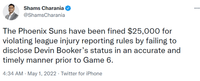 美媒报道称,76人的这次违规,和不久前太阳的类似。当时太阳在首轮G6赛前未能及时更新布克的伤情,被罚款2.5万美元,而76人的罚单金额是太阳的两倍。