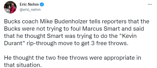 赛后雄鹿主帅布登霍尔泽谈到雄鹿队的最后一防时这样说道:我们并没有试图去对斯玛特故意犯规,我认为斯玛特是想做出‘杜兰特式’的动作,以获得三罚机会,在这样的情况下,我认为给两次罚球是合适的。