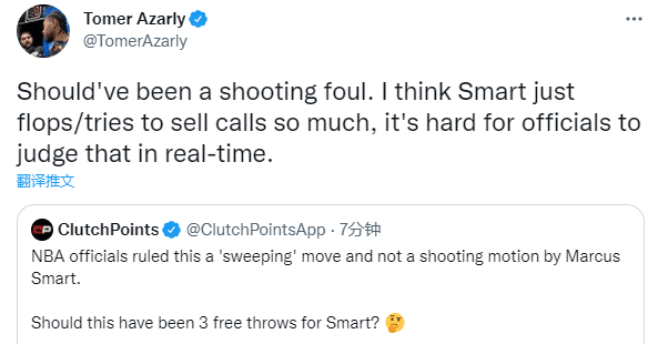 名记Tomer Azarly认为这应该是投篮犯规,究竟是斯玛特该两罚还是三罚,看看明天的裁判报告如何解释。