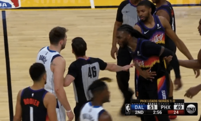 第二节,东契奇休息时,独行侠替补阵容打出15-6攻势反超比分,之后两队展开拉锯战,打着打着东契奇再次开火,连续命中3记三分对飚太阳大军,独行侠半场领先太阳2分;期间东契奇被克劳德挑衅,两人互喷垃圾话,克劳德吃到技犯。