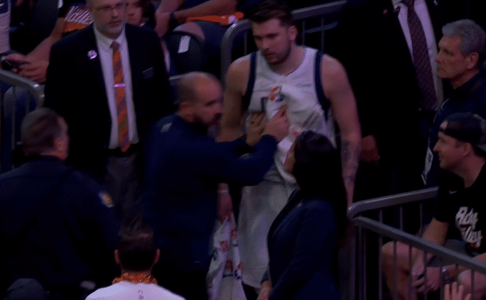 下半场,东契奇第三节3投1中仅仅拿到2分,却出现3次失误,被布里奇斯防得太难受;反观太阳,布克和保罗两大核心都发力砍分,所幸东契奇的队友进攻状态不错,其中布洛克连中三记三分,不过三节打完独行侠落后6分;期间东契奇离场时和球迷发生冲突,互喷指着球迷,所幸被拦住。