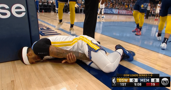 第一节8分54秒,格林惨遭蒂尔曼肘到面部,捂着面部痛苦倒地,裁判没有任何吹罚;格林返回更衣室,离场时冲着灰熊球迷竖中指;勇士官方宣布格林有眼附近撕裂,缝针后回到比赛。