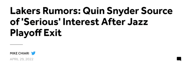 爵士有可能对包括教练组在内的阵容进行重组,斯奈德也有被炒的可能。此前有报道称,由于湖人对待沃格尔的方式,斯奈德对加盟湖人执教的兴趣有所减弱,但如果湖人向他提供一份不错的合同,或许他会改变想法。