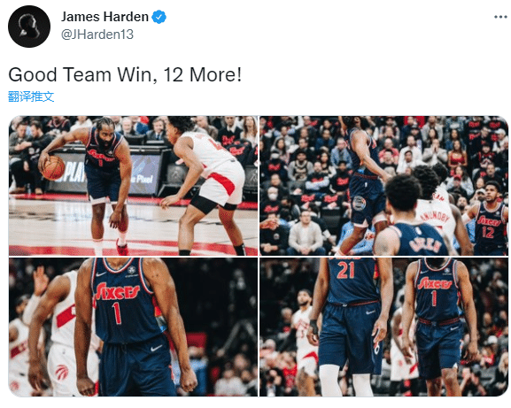 来源:24直播网04-29 16:3324直播网04月29日讯 ,76人首轮4-2淘汰猛龙,哈登全场12投7中拿到22分15助攻6篮板,在场正负值+38;赛后哈登更新社交媒体,晒赛场照并且发推庆祝晋级半决赛:很棒的团队胜利,(距离总冠军)还差12场胜利。