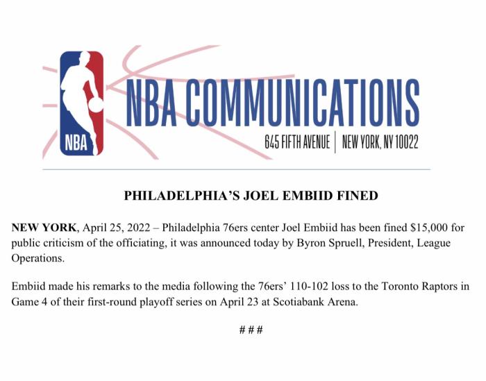 NBA官方罚单:恩比德因批评裁判被罚1.5万,灰熊主帅被罚拒让球员交罚款