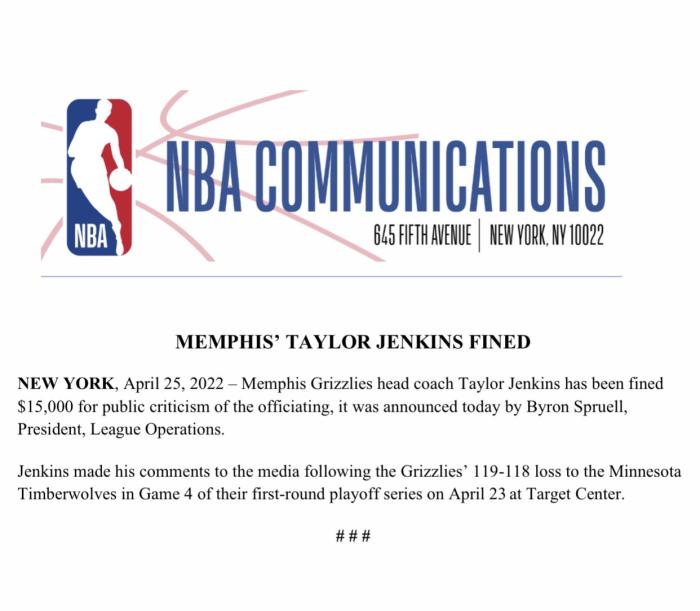 在灰熊和森林狼系列赛G4赛后,詹金斯不满判罚并且炮轰裁判,赛后接受采访时直言:在我看来,这是在我NBA职业生涯中所见过的最差吹罚的比赛之一,我之前从未见过如此尺度不一与傲慢的吹罚。”