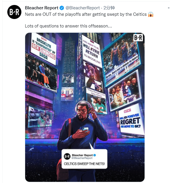 篮网出局,美媒露天看台晒杜兰特回家听音乐的P照,并发推写道,篮网今年休赛期有很多事情要处理;勇士球星格林发推,晒笑哭表情疑似嘲讽杜兰特。