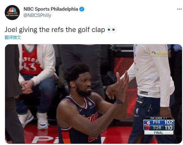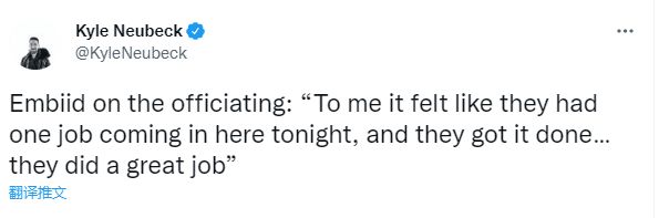 赛后谈到朝裁判鼓掌,恩比德表示:我要接受我给自己的建议,不去抱怨犯规。我很钦佩他们今天做的工作,我感觉裁判像是要来这完成一项任务,他们的任务完成了,且完成得很好,他们做到了,所以我要祝贺他们。